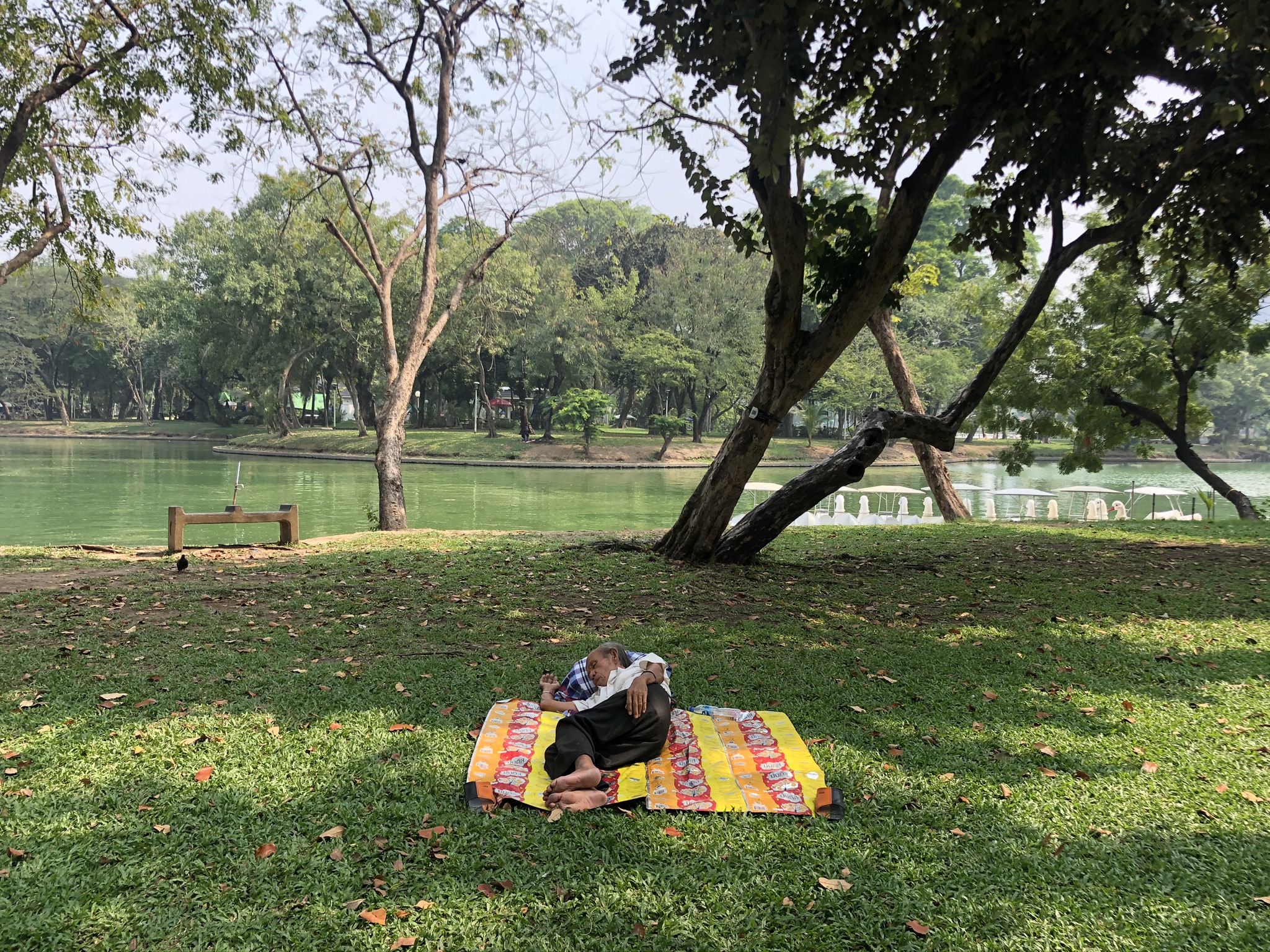 Gezmekten yorulmuş ve sıcaktan bunalmış bir durumdayken çölde bir vaha misali karşımıza çıkan Lumphini Park, parkın sahibi gibi her yerden harşımıza çıkan değişik canlıları (Monitor Lizards) ile biraz korkutsa da gerçekten güzel bir park. Lumphini Park, çimlerine uzanmış dinlenen lokallere, yürüyen, koşan insanlara ve hayatın normal akışına bir nefes olmuş.
